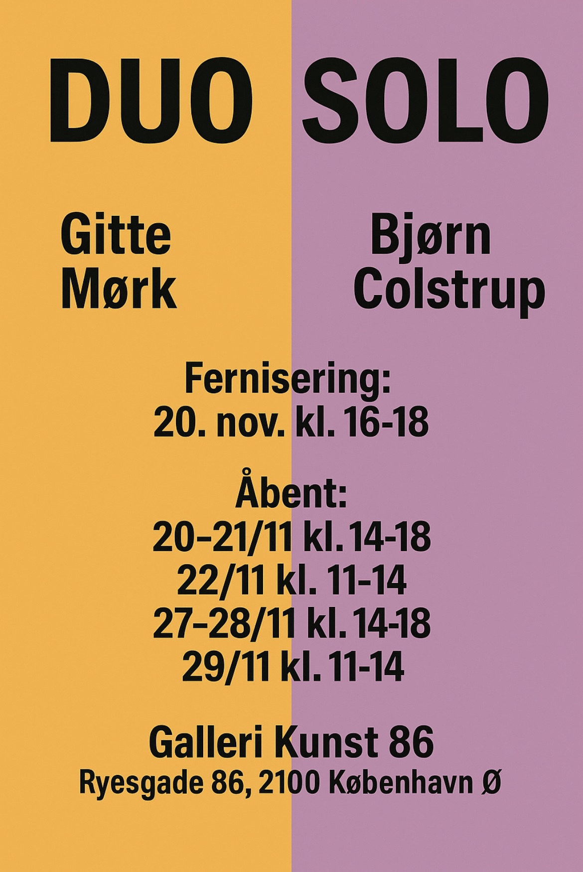 Bjørn Colstrop og jeg udstiller sammen i Galleri KUNST86 20.-29. november 2025. Vi tilstræber, at vores to bidrag, der hver har en solo væg, vil spille sammen i en slags duo. Vi arbejder begge i et renset abstrakt og minimalistisk univers.