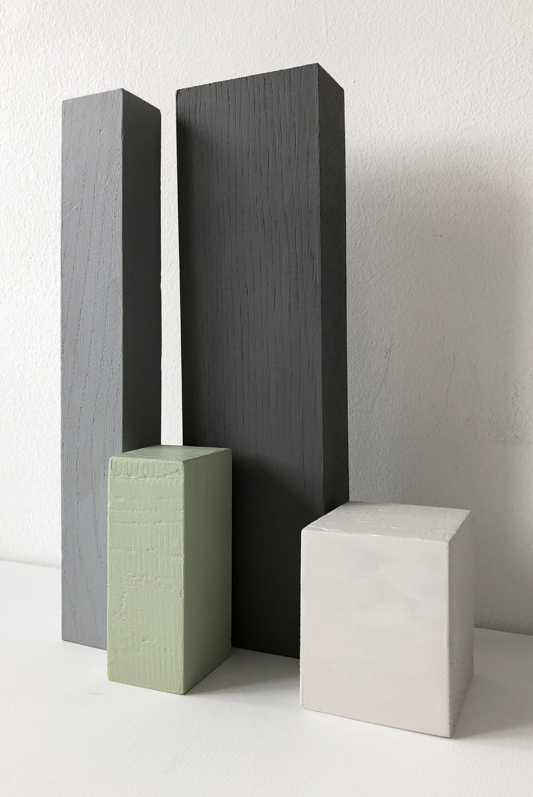 Jeg viser vægobjekter og stående skulpturer af træ bemalet med akryl, samt et enkelt maleri. Jeg betragter det hele som en forlængelse af mine malerier. Farverne er vigtige – fra de dæmpede nuancer til de punktvis klarere farveflader.